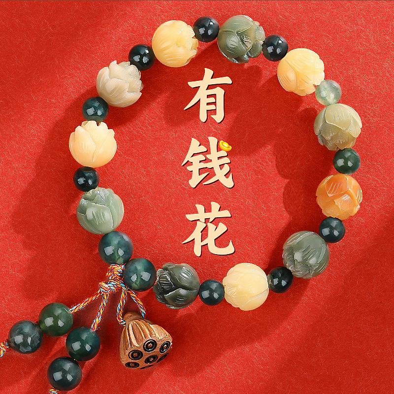 杭州靈隱財神同款有錢花蓮花手串綠檀木水草瑪瑙手工雕刻多寶佛珠