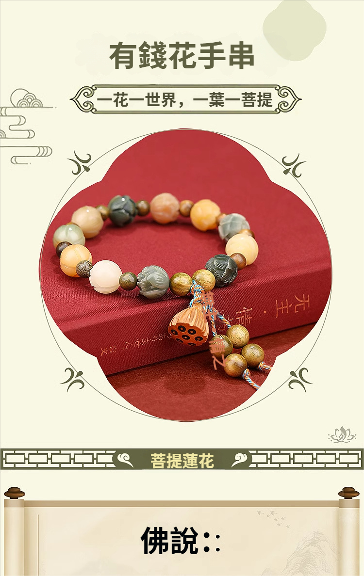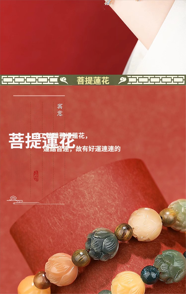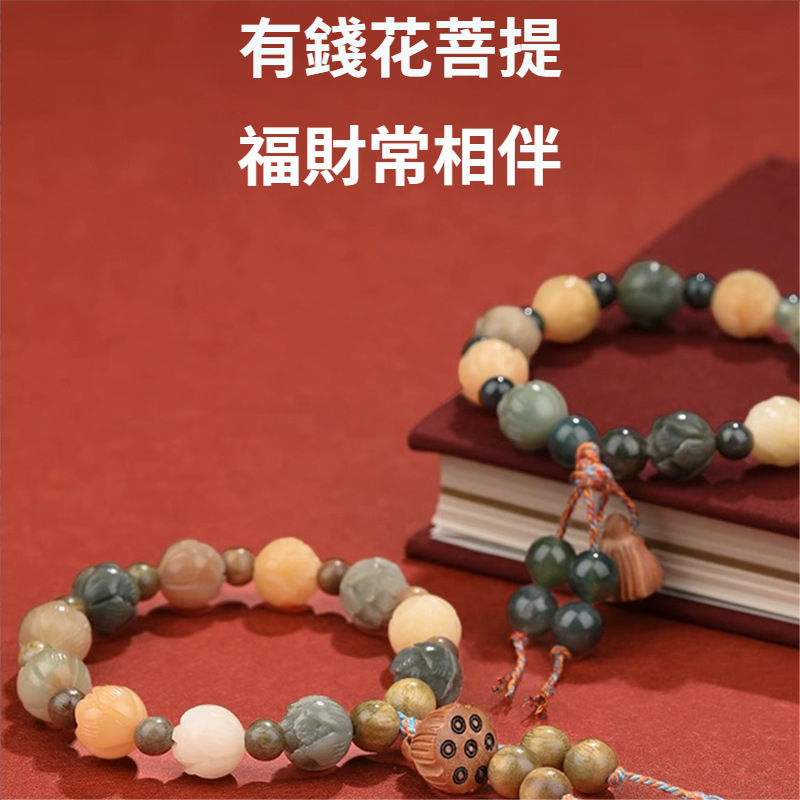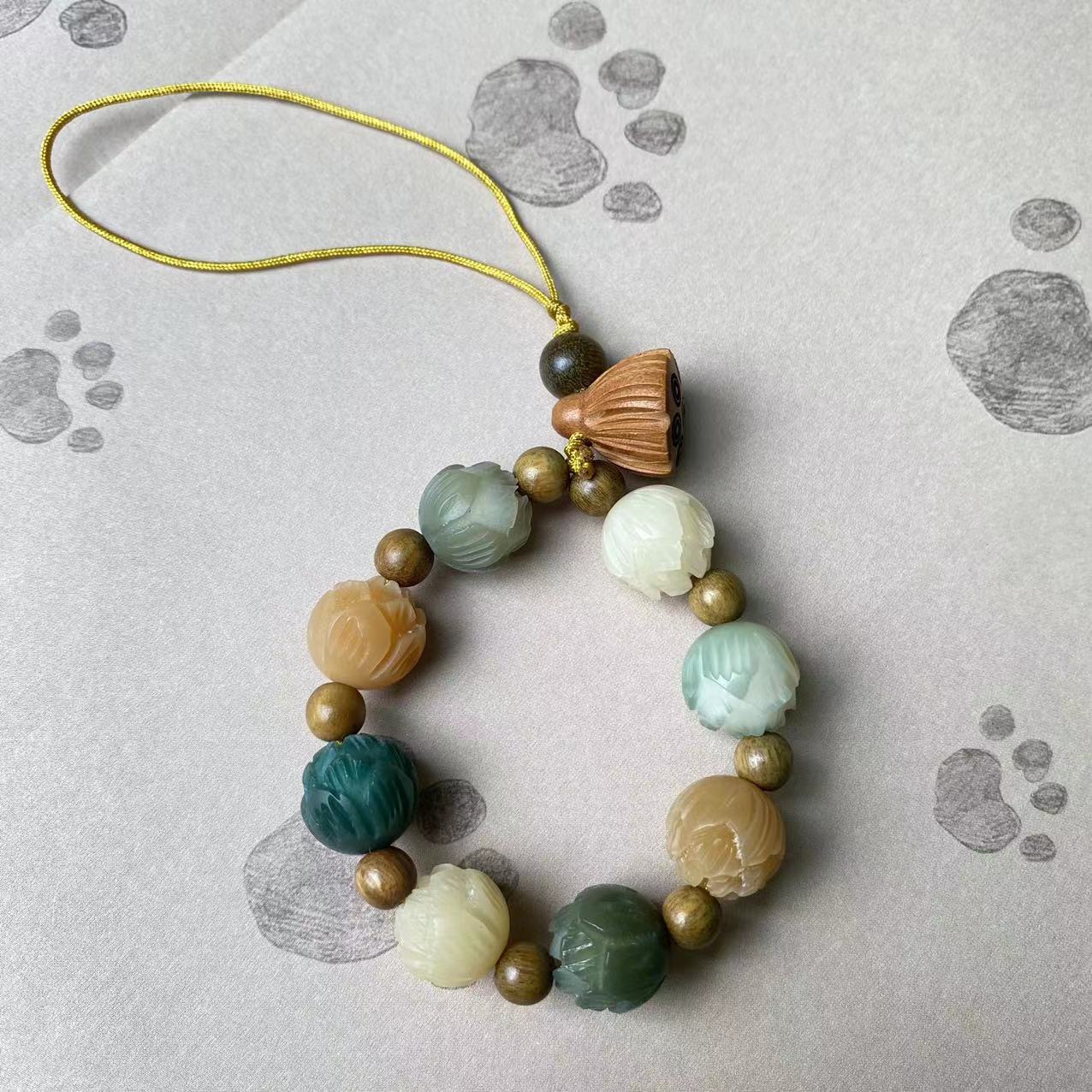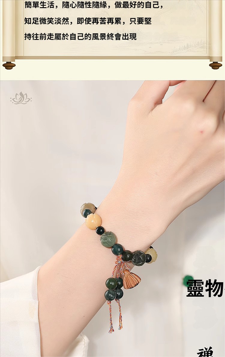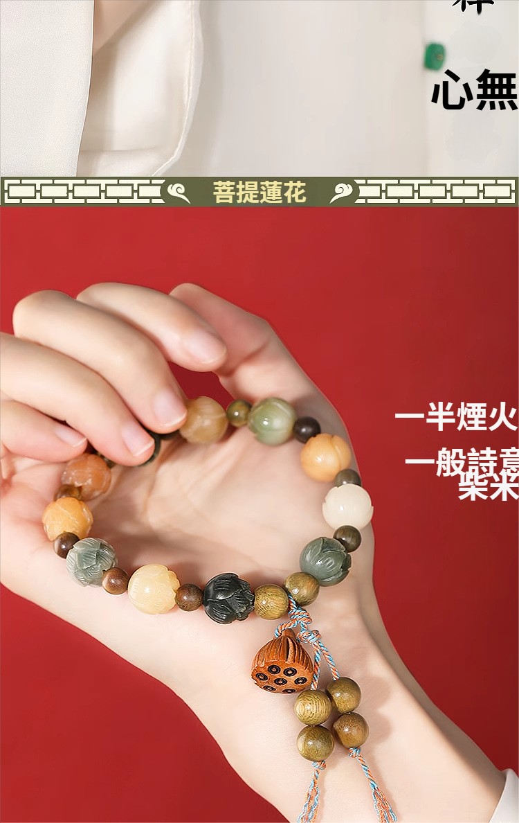 綠檀木生香,手工雕「有錢花」紋,每轉一圈都是「財來」的信號;水草瑪瑙裹著江南煙雨,蓮花墜子墜著「花開見喜」。