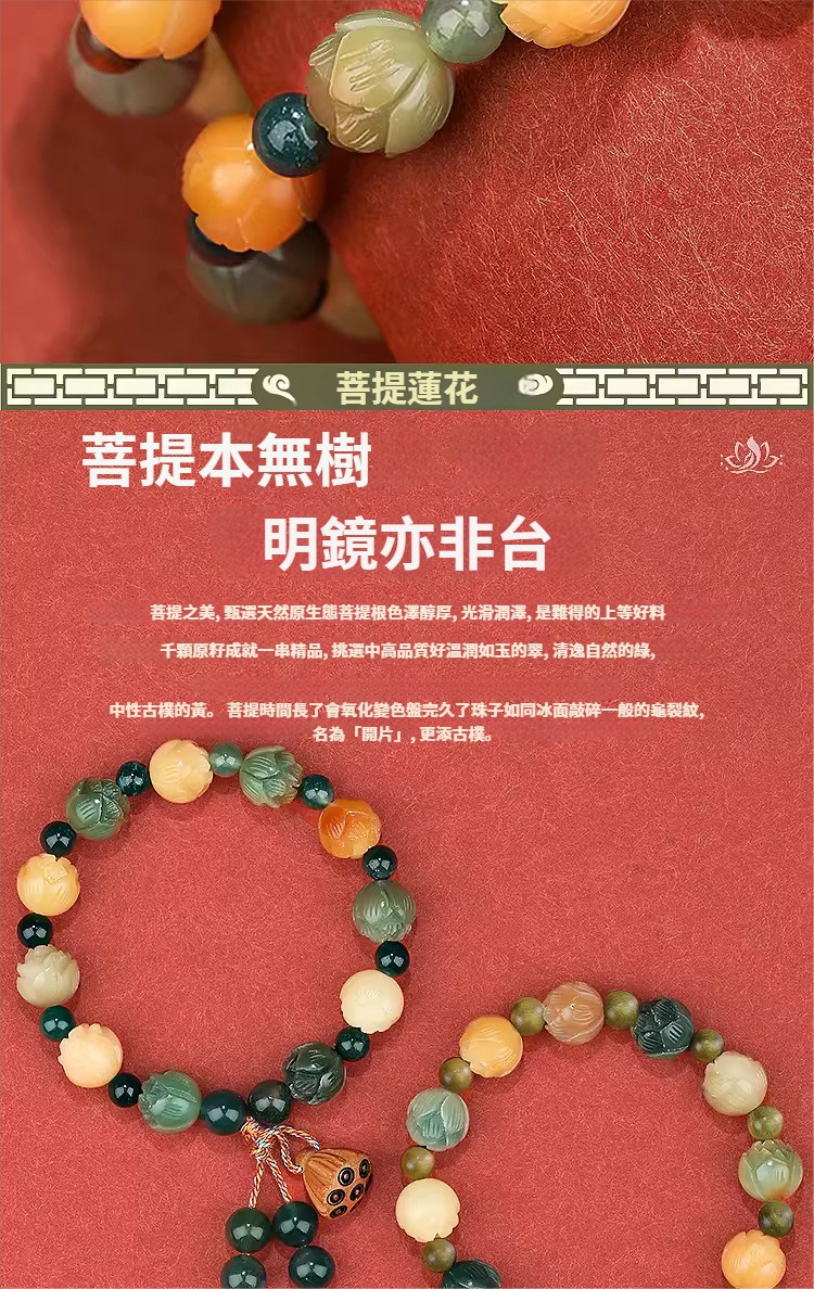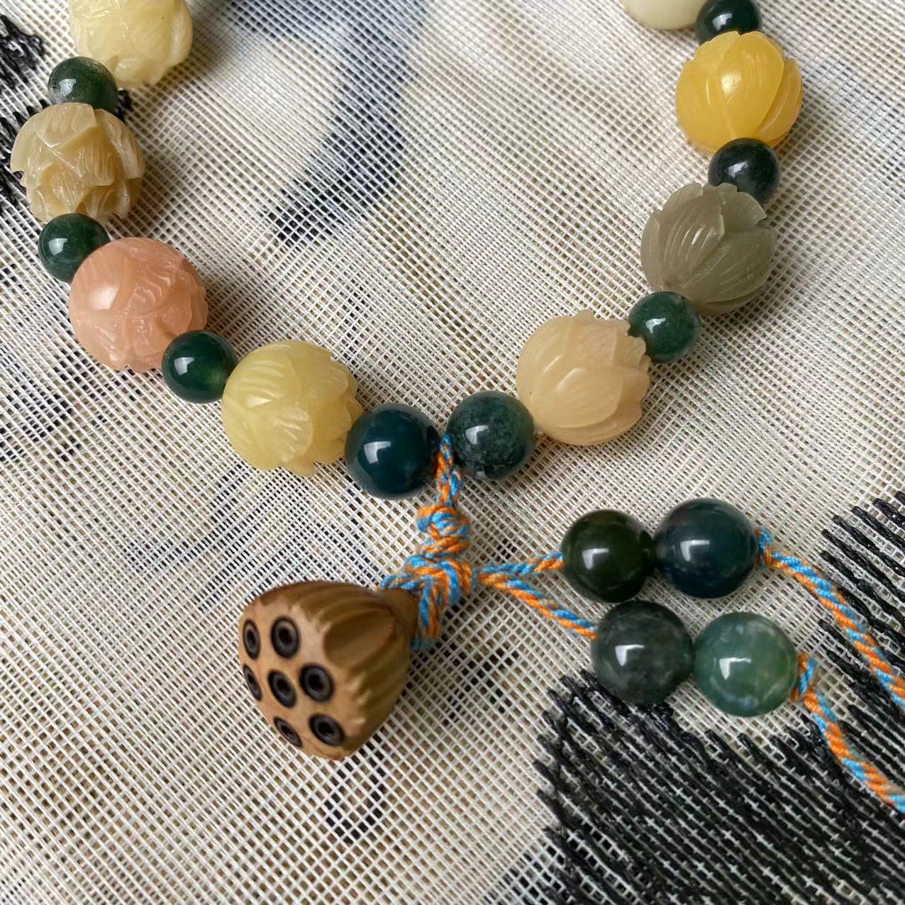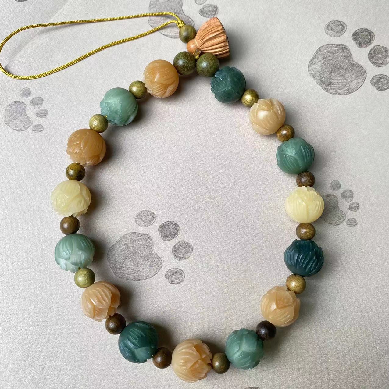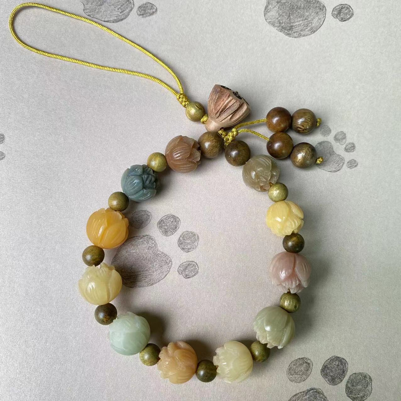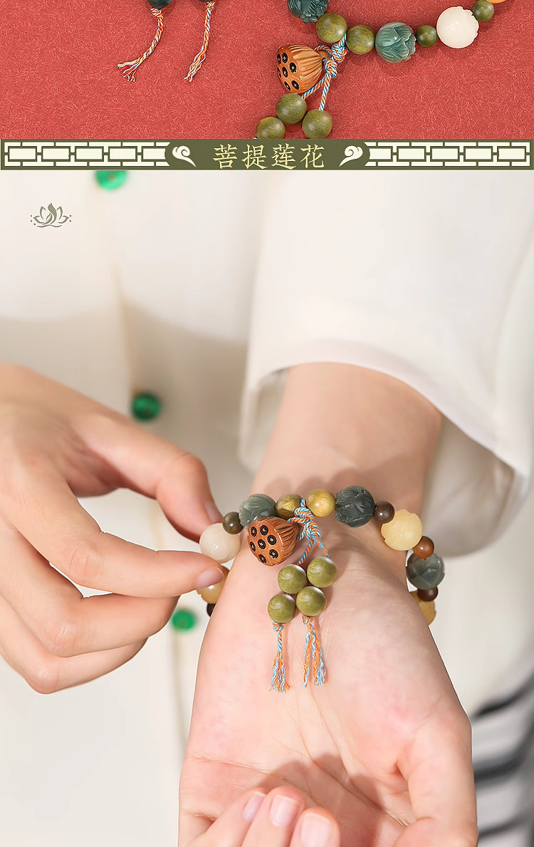 綠檀木生香,手工雕「有錢花」紋,每轉一圈都是「財來」的信號;水草瑪瑙裹著江南煙雨,蓮花墜子墜著「花開見喜」。