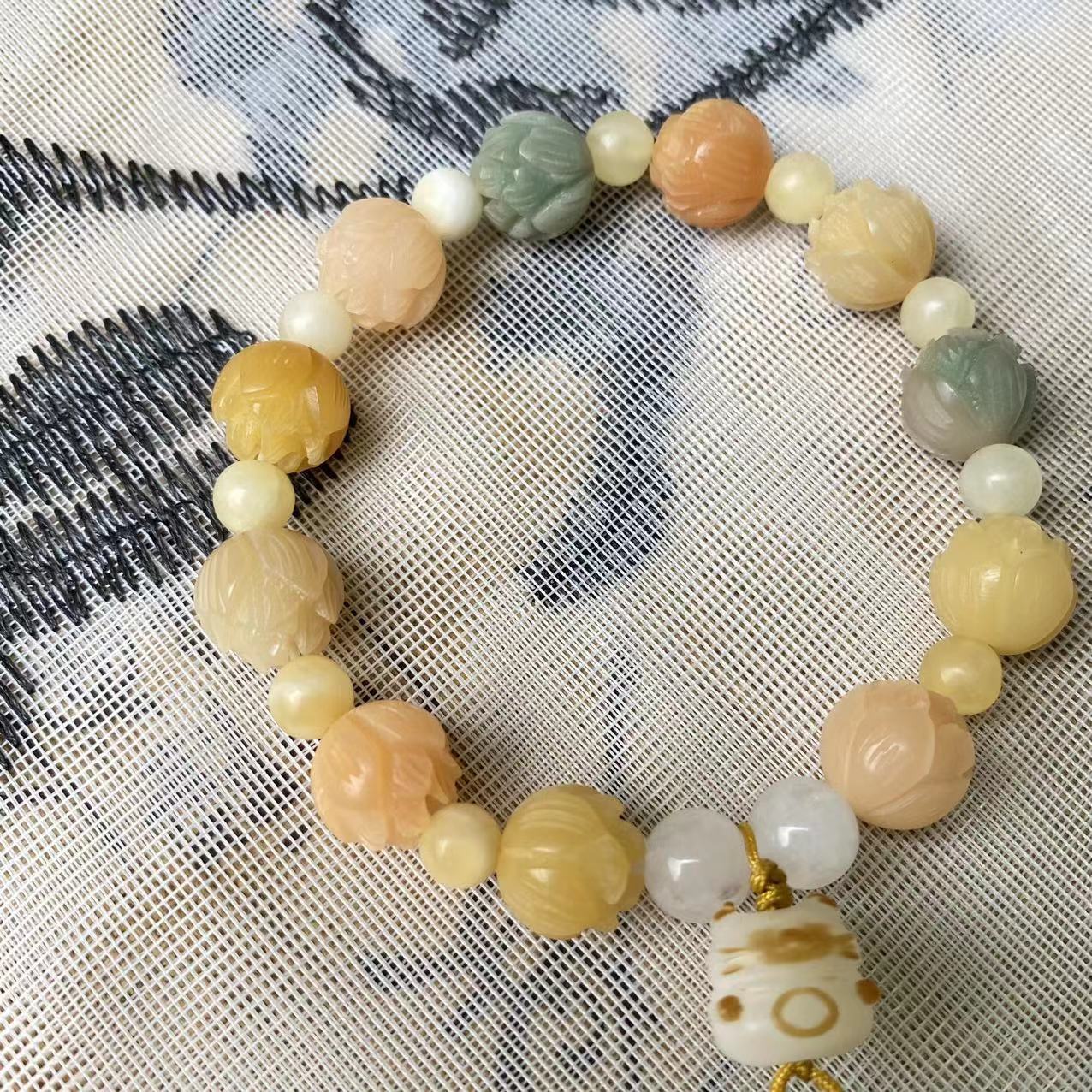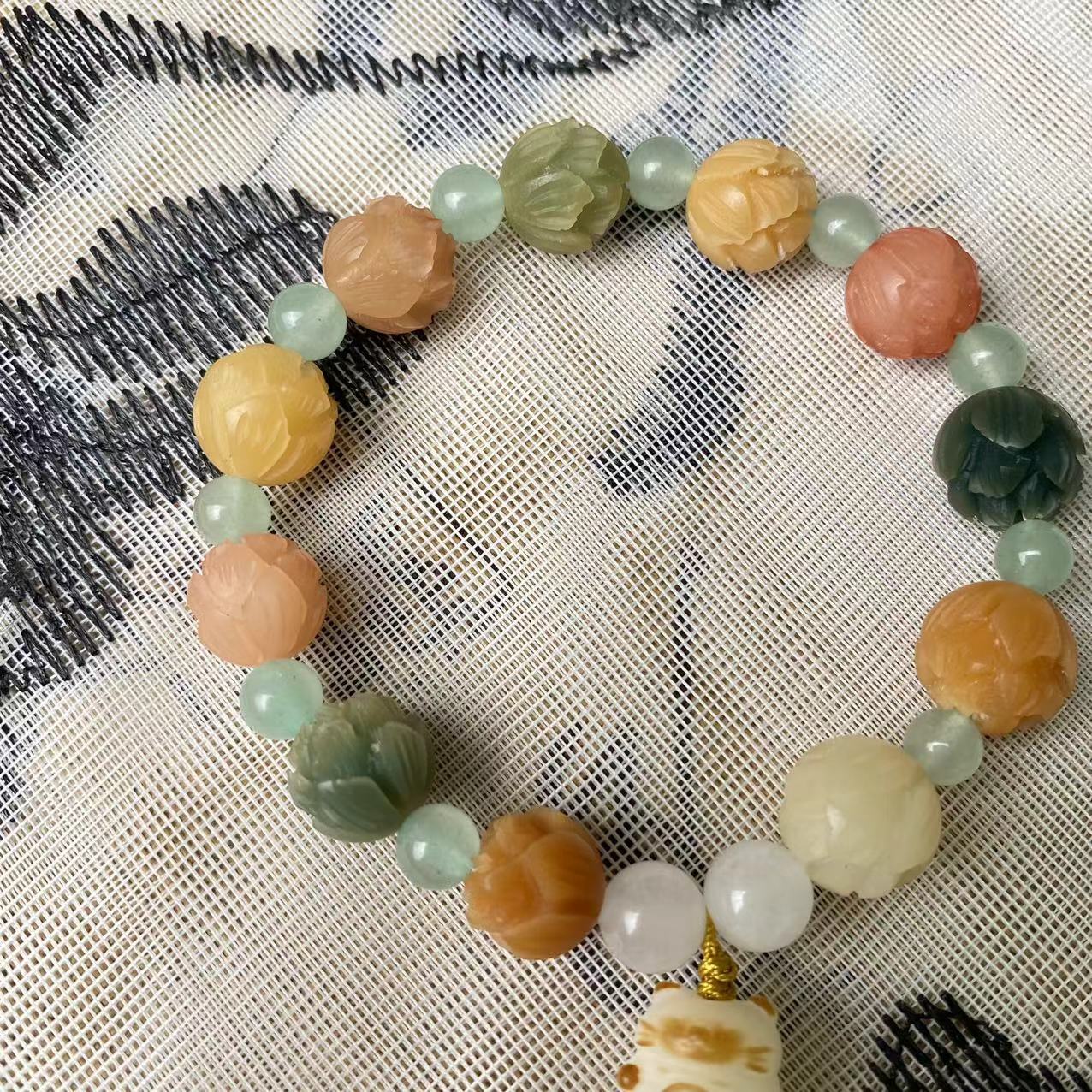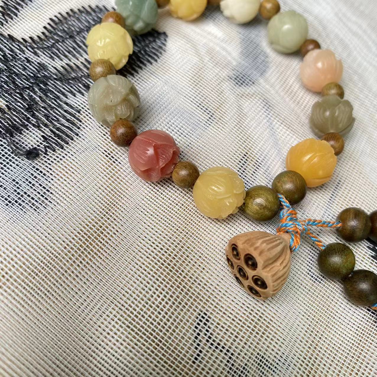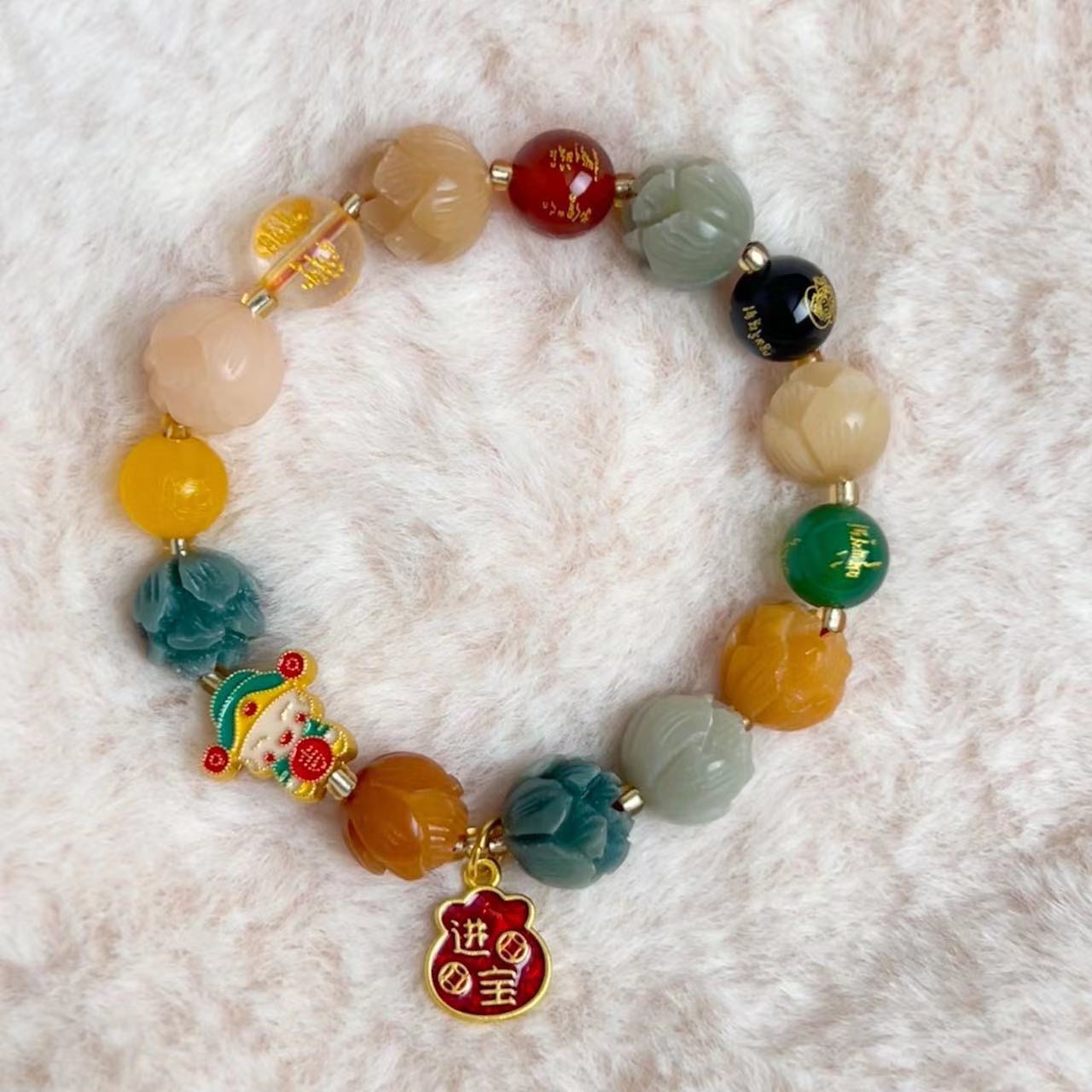 綠檀木生香,手工雕「有錢花」紋,每轉一圈都是「財來」的信號;水草瑪瑙裹著江南煙雨,蓮花墜子墜著「花開見喜」。