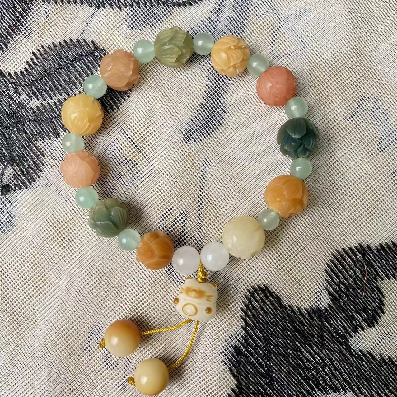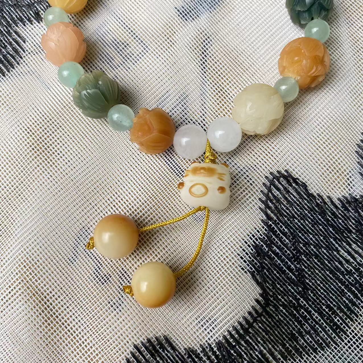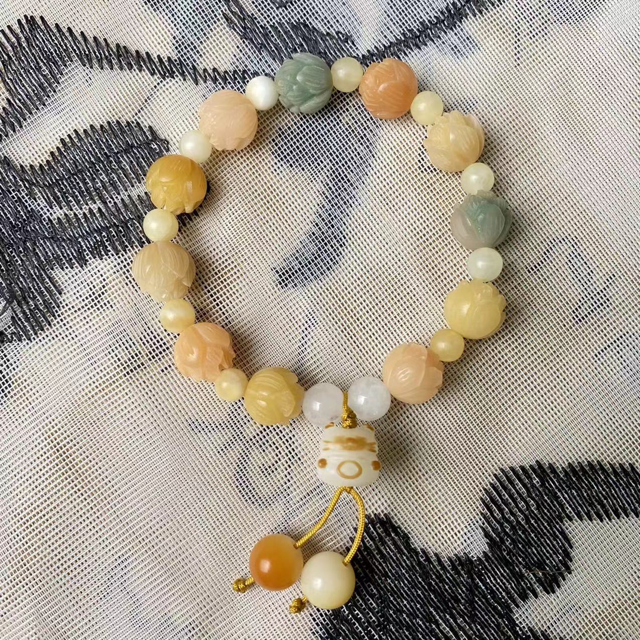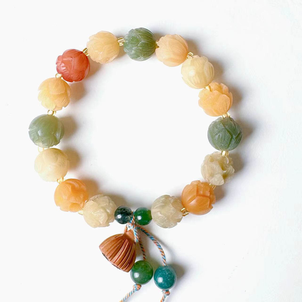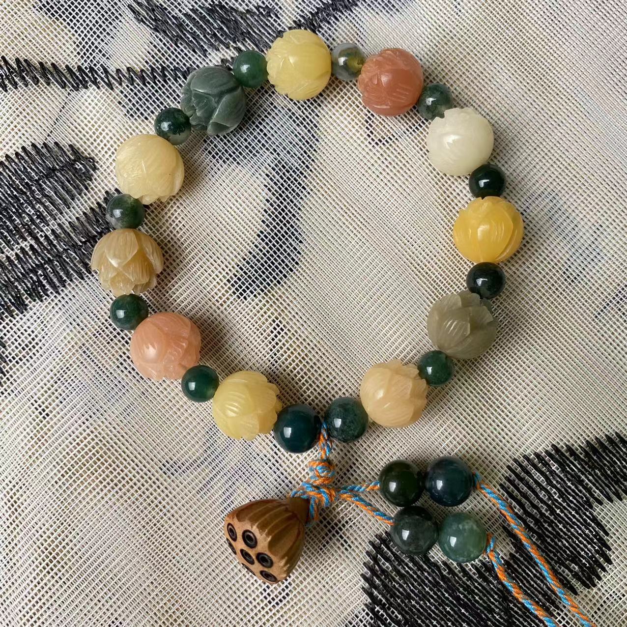 綠檀木生香,手工雕「有錢花」紋,每轉一圈都是「財來」的信號;水草瑪瑙裹著江南煙雨,蓮花墜子墜著「花開見喜」。