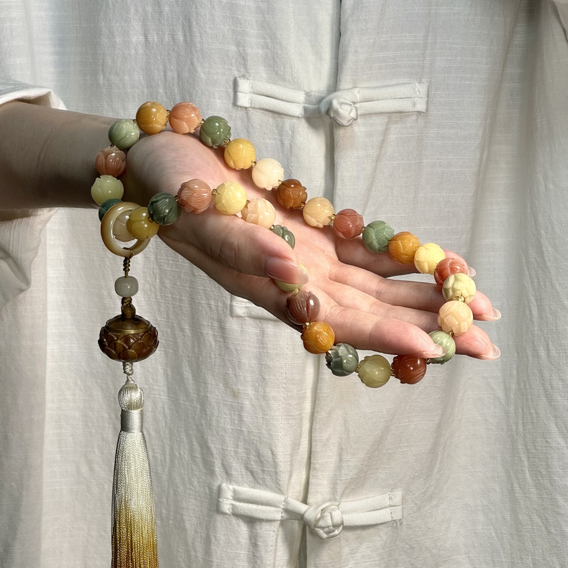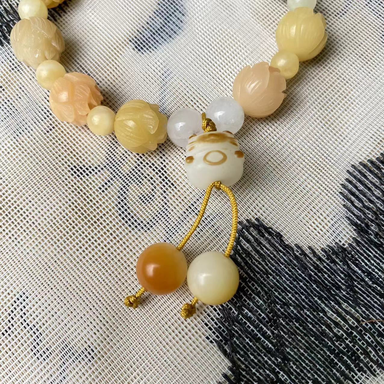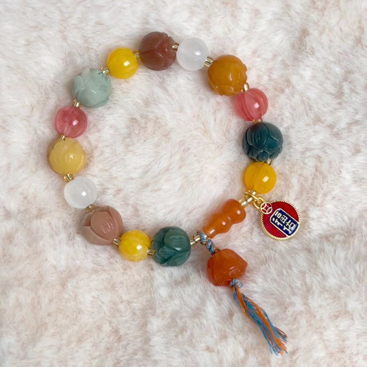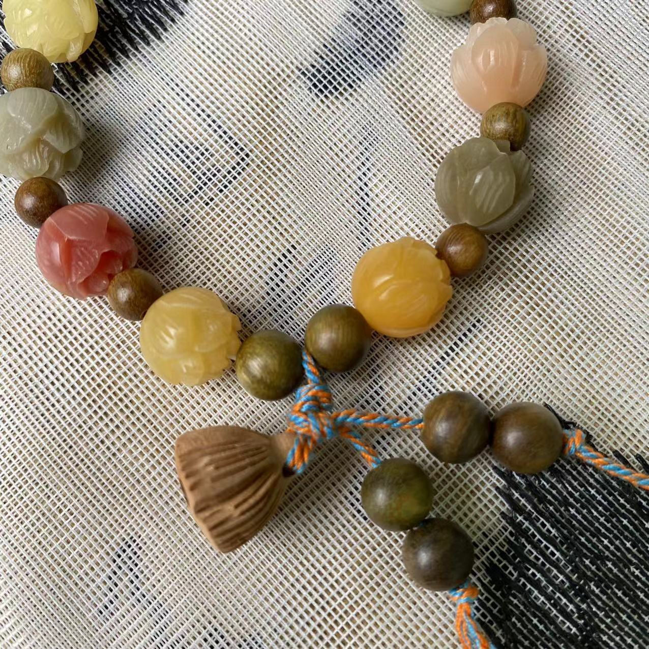 綠檀木生香,手工雕「有錢花」紋,每轉一圈都是「財來」的信號;水草瑪瑙裹著江南煙雨,蓮花墜子墜著「花開見喜」。